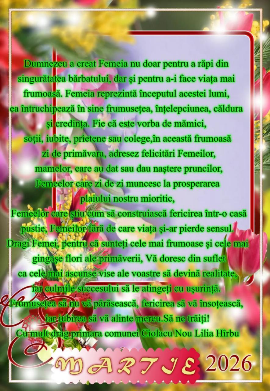 Dragi Femei, pentru că sunteți cele mai frumoase și cele mai gingașe flori ale primăverii, Vă doresc din suflet ca cele mai ascunse vise ale voastre să devină realitate, iar culmile succesului să le atingeți cu ușurință. Frumusețea să nu vă părăsească, fericirea să vă însoțească, iar iubirea să vă alinte mereu.